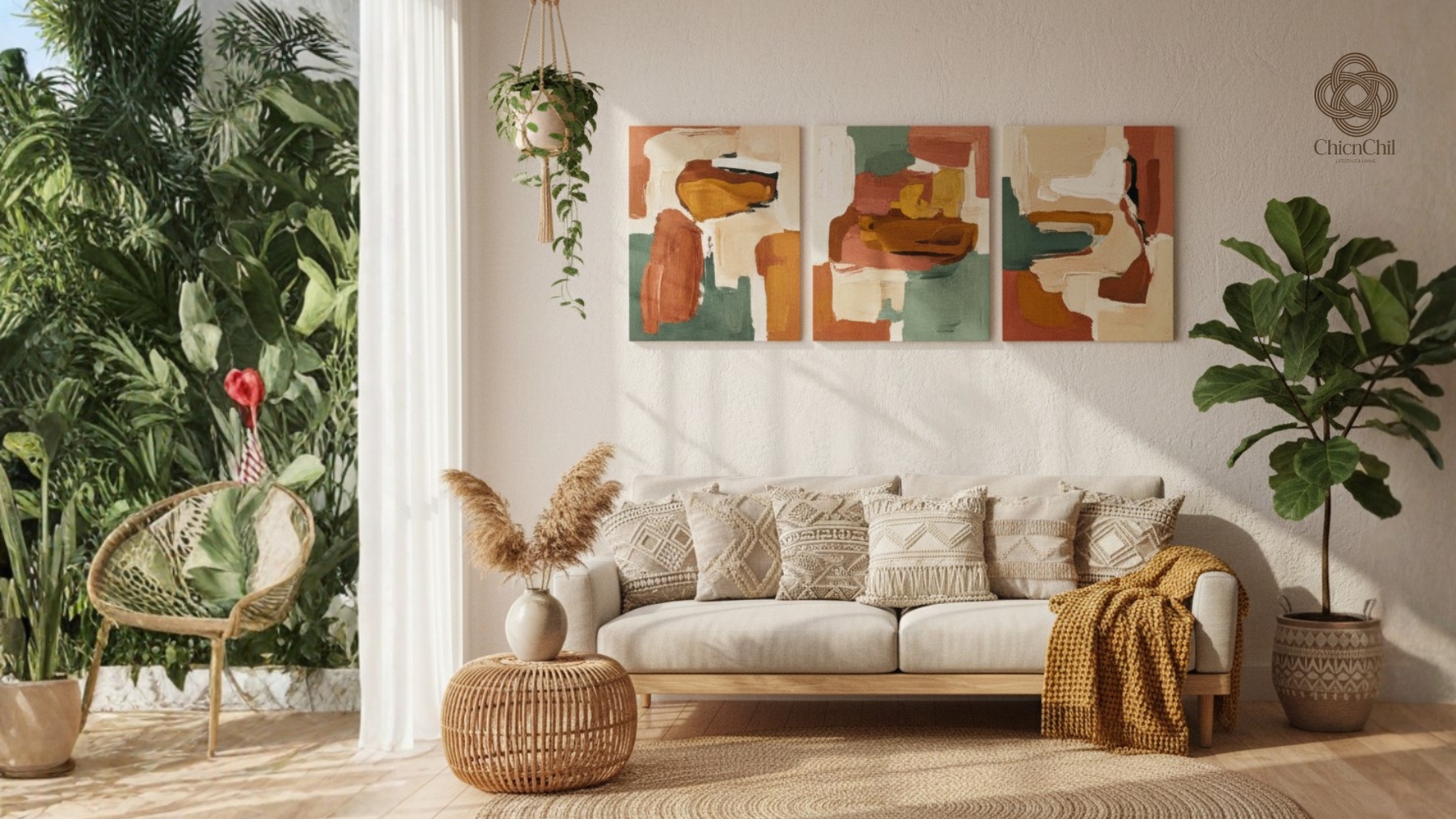 Canvas art is a fantastic way to display high-quality prints or your own paintings. For a more eclectic look, combine canvas pieces with boho elements like woven wall fans to blur the boundary between traditional and modern styles.